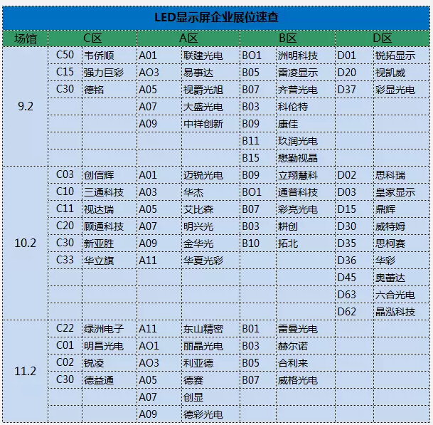 以下展位分布表根据广州国际智能广告标识博览会主办方2月6日提供的展位分布图整理,如后期存在变动,请以主办方提供的材料为准。