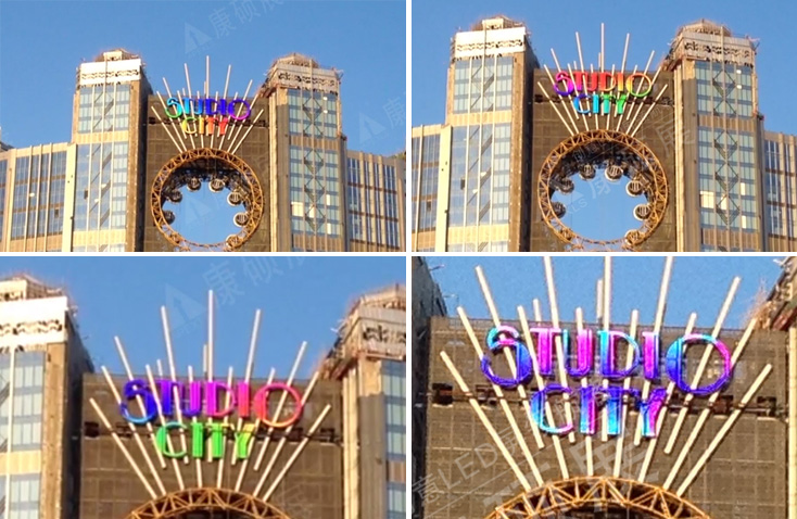 项目介绍:康硕展电子为澳门“STUDIO CITY”制作的视频标识,每一个字母区域为LED显示屏制作,字母以外区域完全镂空,面积达一百四十余平方,不仅能显示商家的LOGO,还能播放视频,根据需求播放广告等内容,极大的提升了企业的商业价值。该视频标识摒弃了传统发光字的做法,采用显示屏的做法,较常规箱体式LED显示屏节能达60%以上,重量轻,维护简易,高标准工艺处理,显示屏亮度高,产品防护等级高达IP65,能完全适应各种恶劣气候,并且可以远程控制,适应户外长期使用等。该标识极大的吸引人的眼球,让建筑成为城市新地标。