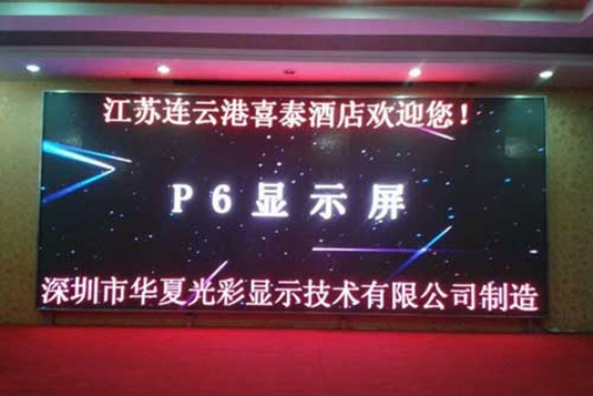 日前,华夏光彩在江苏连云港喜泰酒店新装了一块12平方米的LED显示屏,入住的新老客户和来酒店办理宴席的宾客都对这一新作品表示满意和喜欢。酒店也因此对华夏光彩显示屏制造方表达了赞许和肯定。
