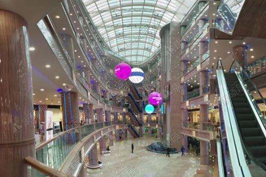 2014年8月,康硕展为莫斯科rio商场定制了LED球形屏,3个2米直径P7.62规格的LED球形屏,采用吊装方式安装,现场效果非常震撼,到场观众纷纷驻足观看,为该商场添光溢彩。