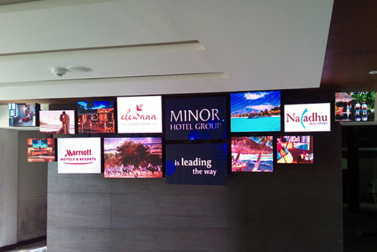 视爵光旭和视频设计公司共同合作一起完成了这个辉煌靓丽的定制性LED显示屏项目。这块LED显示屏被安装在泰国普吉岛安娜塔拉度假村的大厅,用来显示公司历史,自主和合作品牌,以及度假村的美景。