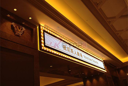 此次锐拓PH4高清全彩LED显示屏完美落户于有顶级艺术殿堂之称的威尼斯人剧场,面积总计56.84㎡,全天候播放剧场演出信息及演出的精彩的瞬间,高清、流畅的视频画面吸引了众人的眼球,为威尼斯人剧场带来了更多的客流量,起到了极佳的广告宣传效果。