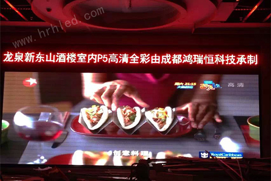 由成都鸿瑞恒科技有限公司12平米的P5室内全彩屏应用于成都龙泉酒楼发布活动信息、婚庆庆典等。