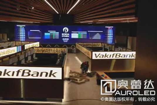 奥蕾达科技ATP隔断系列P10内全彩LED显示屏应用于土耳其证券交易市场,显示屏面积为55平方米。