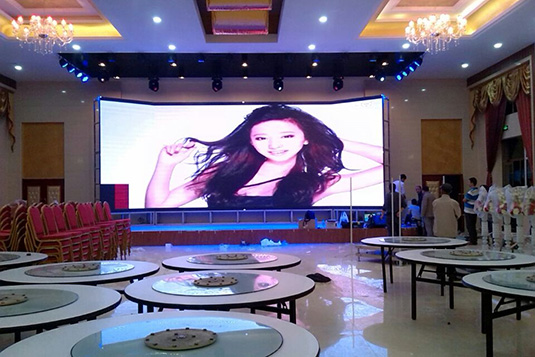四子王旗大舜酒店LED显示屏系统由深圳市彩视光电承制,采用户内P7.62全彩,结构内弧,总面积47平方米。