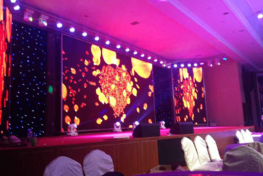 彩视光电有幸成为大连增信大酒店的LED显示屏供应商,60²、20m²的户内P5显示屏安装在舞台后方,显示屏箱体较轻,安装维护方便,同时具有主屏移动开合以及140度的宽视角,为舞台表演提供放映和模拟场景的作用。