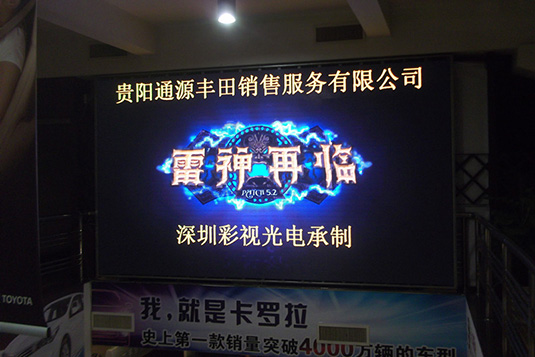 贵阳通源丰田4S店LED显示屏系统由彩视光电承制!采用户内P4高清全彩,主要用于4S店内车型展示、品牌宣传等。P4户内全彩屏采用托架结构,易于安装及后期维护!