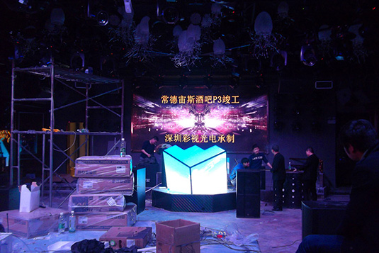 酒吧内部宙斯酒吧LED显示屏已经全部安装调试完毕。酒吧内部DJ台酒吧背景屏幕采用户内高清P3全彩。