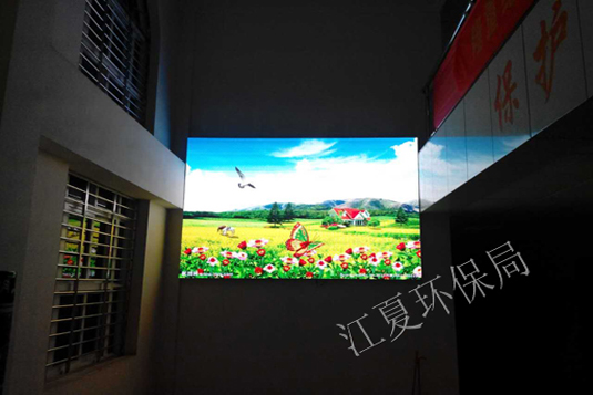 江夏环保局室内全彩LED显示屏采用P4规格,面积5.41平米。