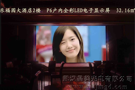 武汉乐福源酒店2楼宴会厅室内全彩LED显示屏采用P6规格,面积32平米。