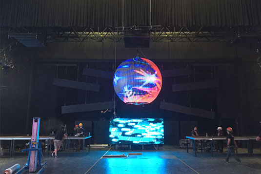 该项目为直径3M球,使用软屏系列MJ4产品, 总共192串,每串59个灯点,顶部和底部镂空,需制作球形框架,将灯点卡在弧形铝条上,铝条固定在框架上,安装便捷,可吊装可坐装。