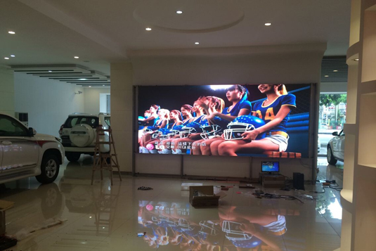湾畔国际名车中山古镇店室内全彩LED显示屏采用P5规格,面积9平米。