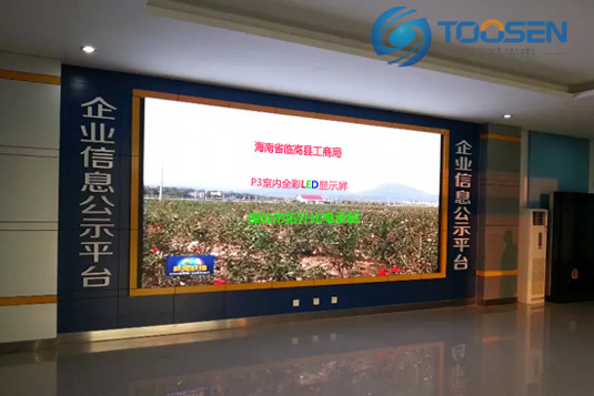 海南省临高县工商局室内全彩LED显示屏采用P3规格,面积9.216平米。